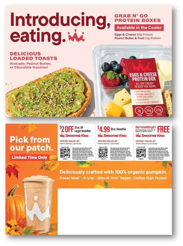 Postcards will feature Loaded Toasts, Protein Boxes and Pumpkin and 3 offers on the back. Postcards will be printed with your location information in black on each offer.
